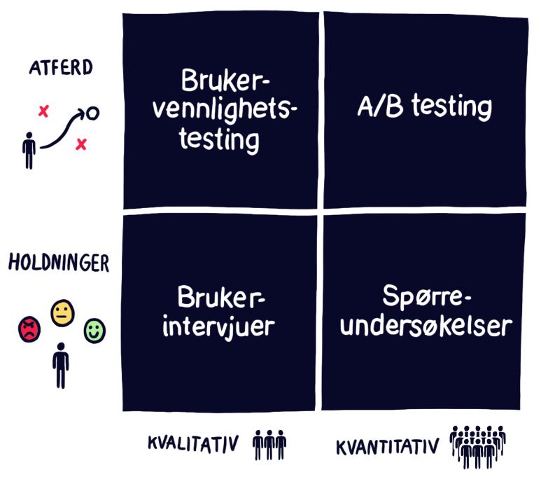 Som du ser, skiller vi mellom metoder som fanger opp brukernes holdninger og metoder som observerer brukernes atferd. Metodene for holdninger gir innsikt i hva brukerne sier og føler. Metodene for atferd gir deg svar på hva de faktisk gjør.